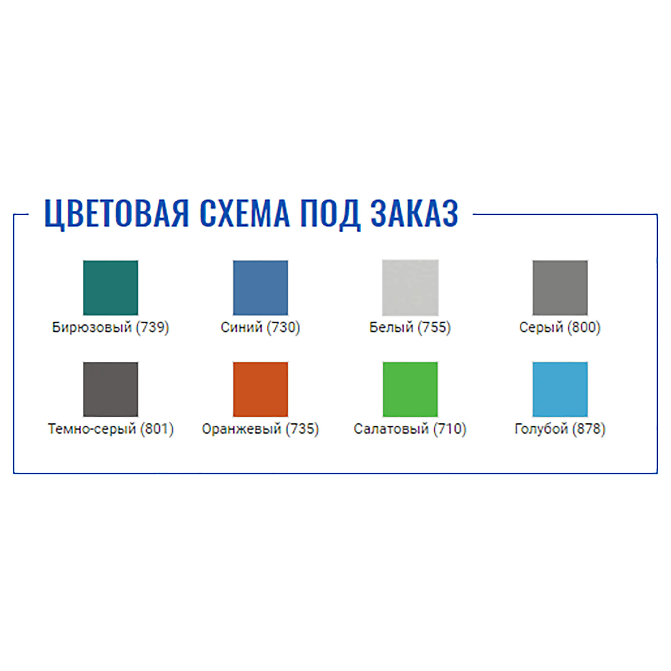 Синий, Тёмно-серый, Серый, Голубой, Салатовый, Оранжевый, Слоновая кость, Бирюзовый, Белый
