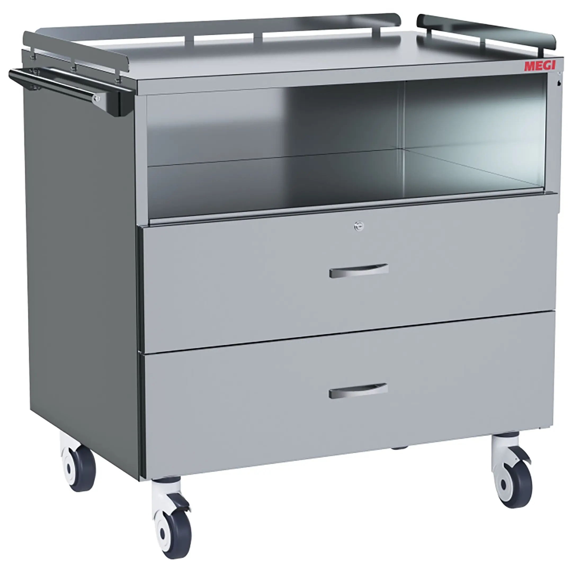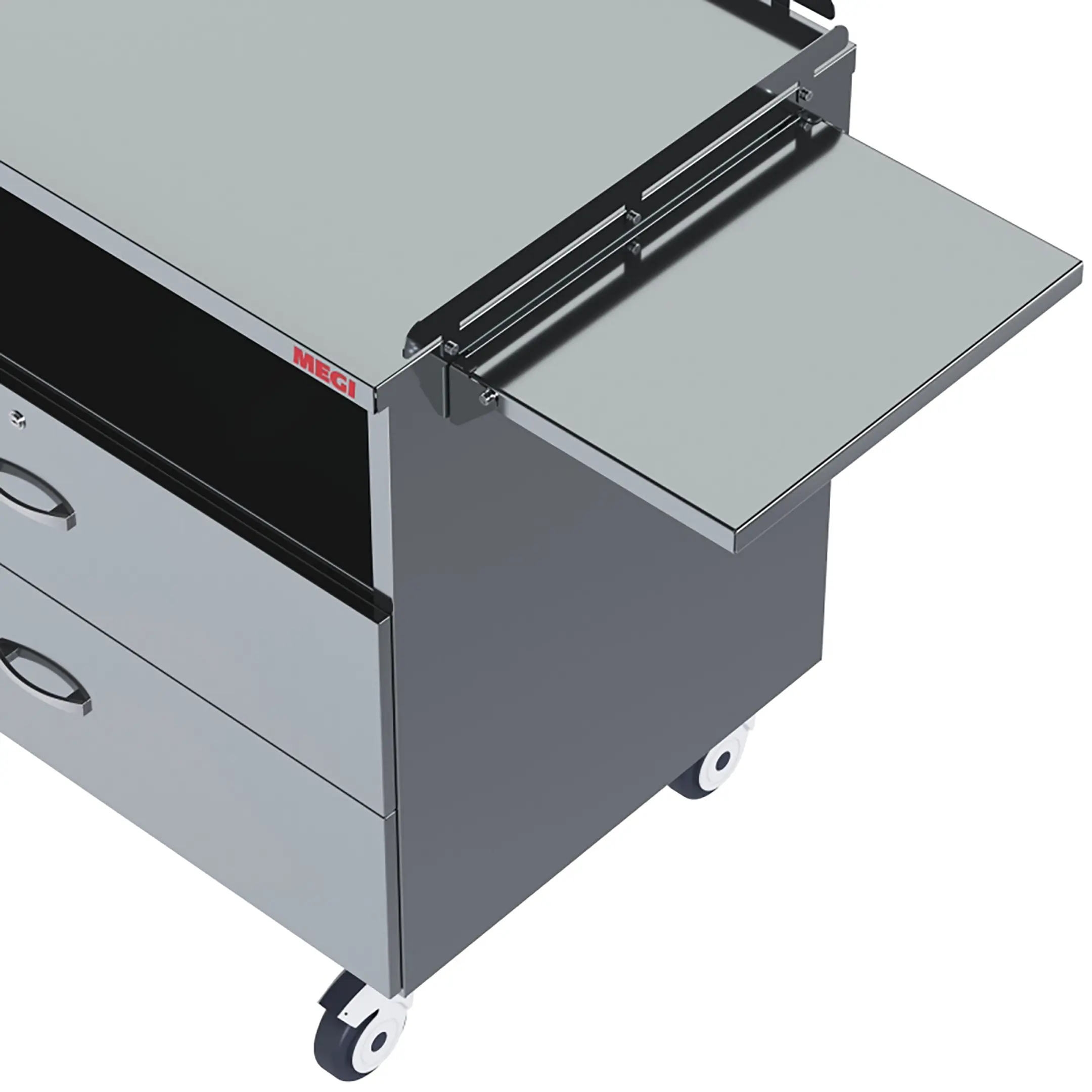 • колеса поворотные, самоориентирующиеся, диаметром 100 мм, комплектуются надёжной стальной вилкой с прецизионным радиально-упорным подшипником, ободом из полипропилена и шинкой из серого полиуретана, не оставляющего следов на полу, два колеса – с индивидуальным тормозным устройством;