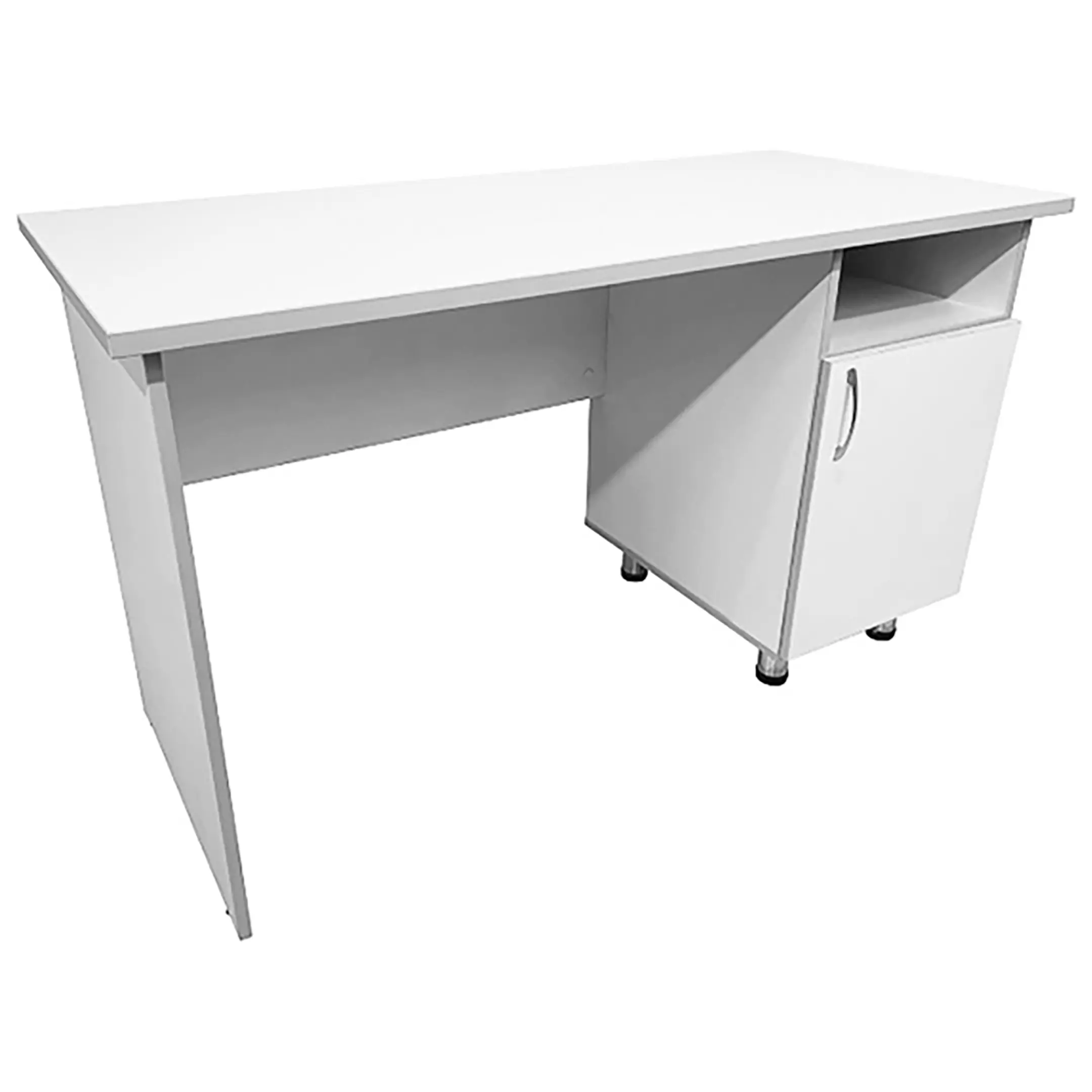 • Стол оснащен боковой тумбой, оборудованной верхней открытой нишей и вместительным отделением с полкой, закрытым распашной дверкой.