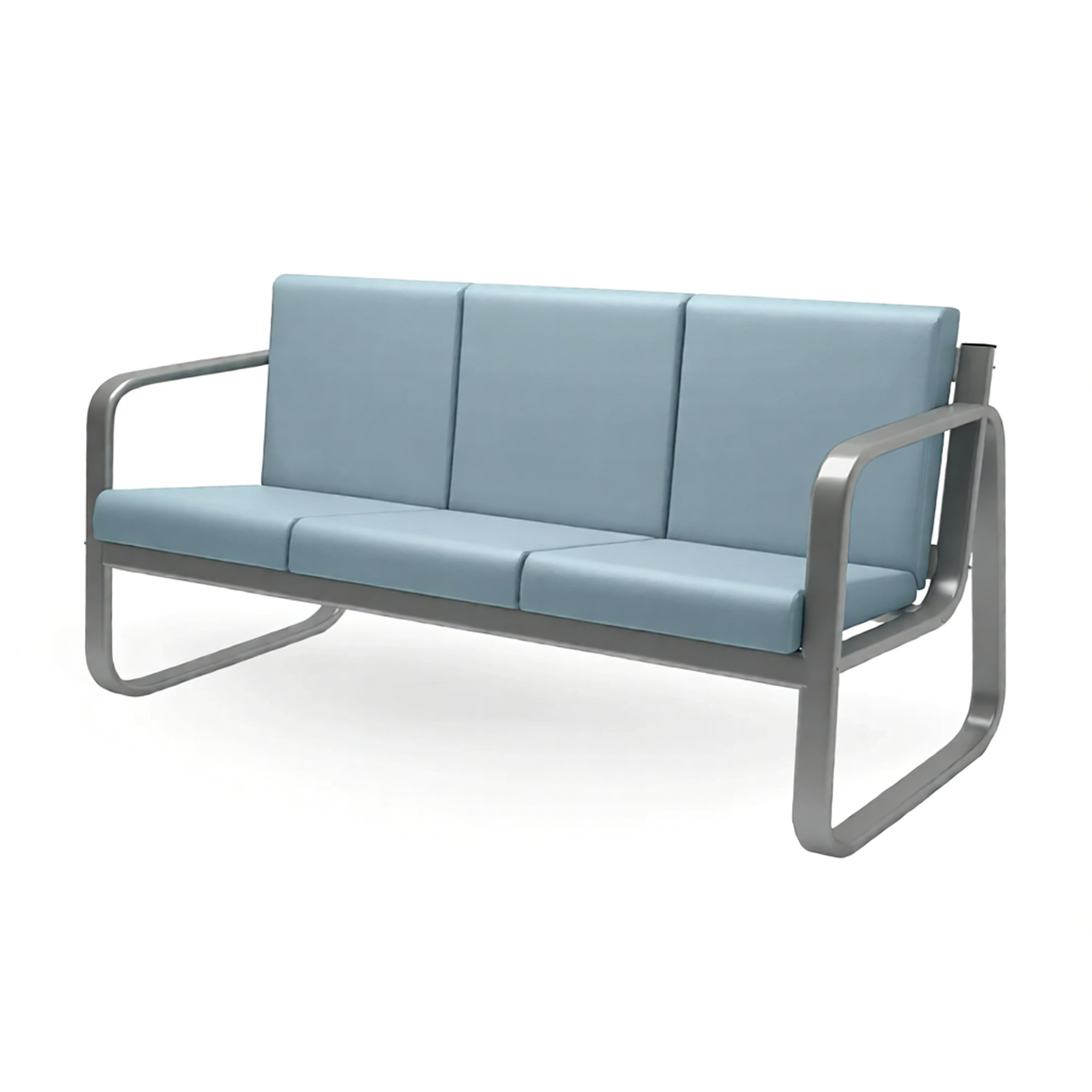 Поверхность облицована приятной на ощупь искусственной кожей, стойкой к истиранию и загрязнениям. Мебель предлагается в удобной упаковке для транспортирования: секции сидений и боковых стоек аккуратно уложены в прочные коробки из гофрокартона размера 660х660х900 мм, а элементы металлической рамы упакованы в специальную защитную безузловую сетку и картон.