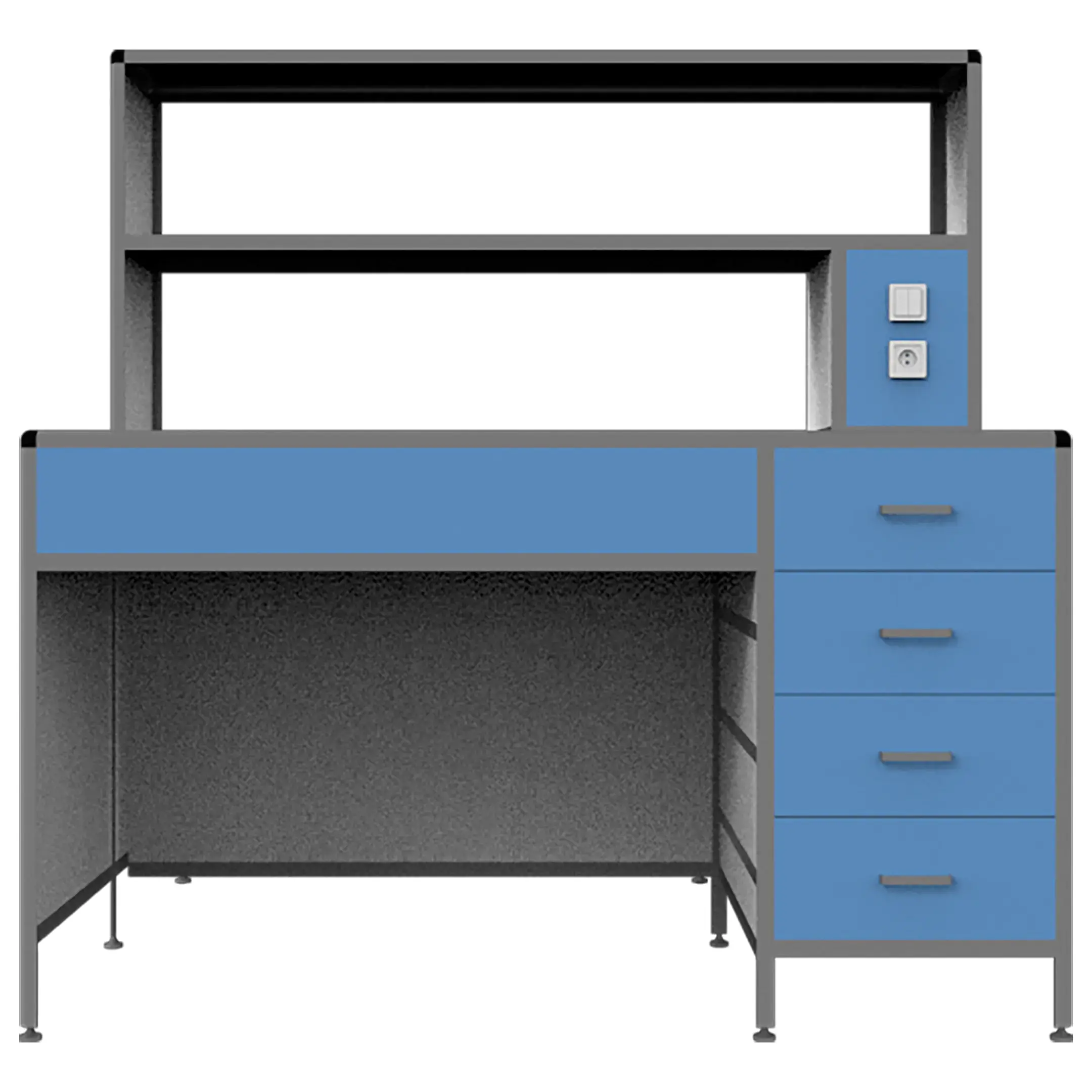 - Функциональная надстройка — с двумя сквозными полками, двумя розетками и светодиодными светильниками для освещения рабочей зоны.