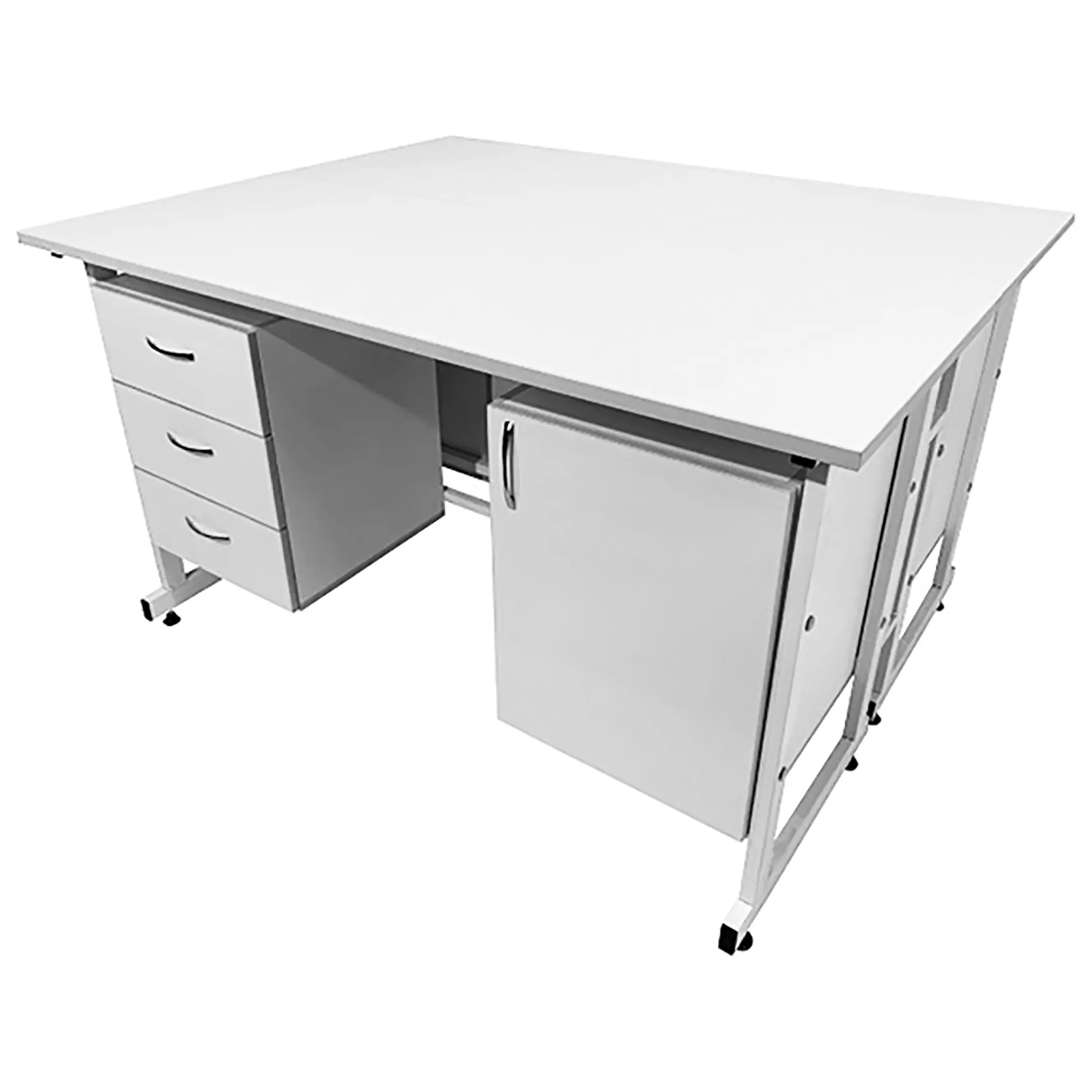 Стол лабораторный островной Сло 22.006 (белый) — это функциональное и стильное решение для организации двух рабочих мест в лабораториях, медицинских учреждениях и других профессиональных помещениях. Модель оснащена двумя рабочими местами, каждое с двумя подвесными тумбами: слева с тремя выдвижными ящиками, справа с распашной дверкой и полкой. Каркас выполнен из стального профиля, столешницы из ЛДСП толщиной 22 мм.