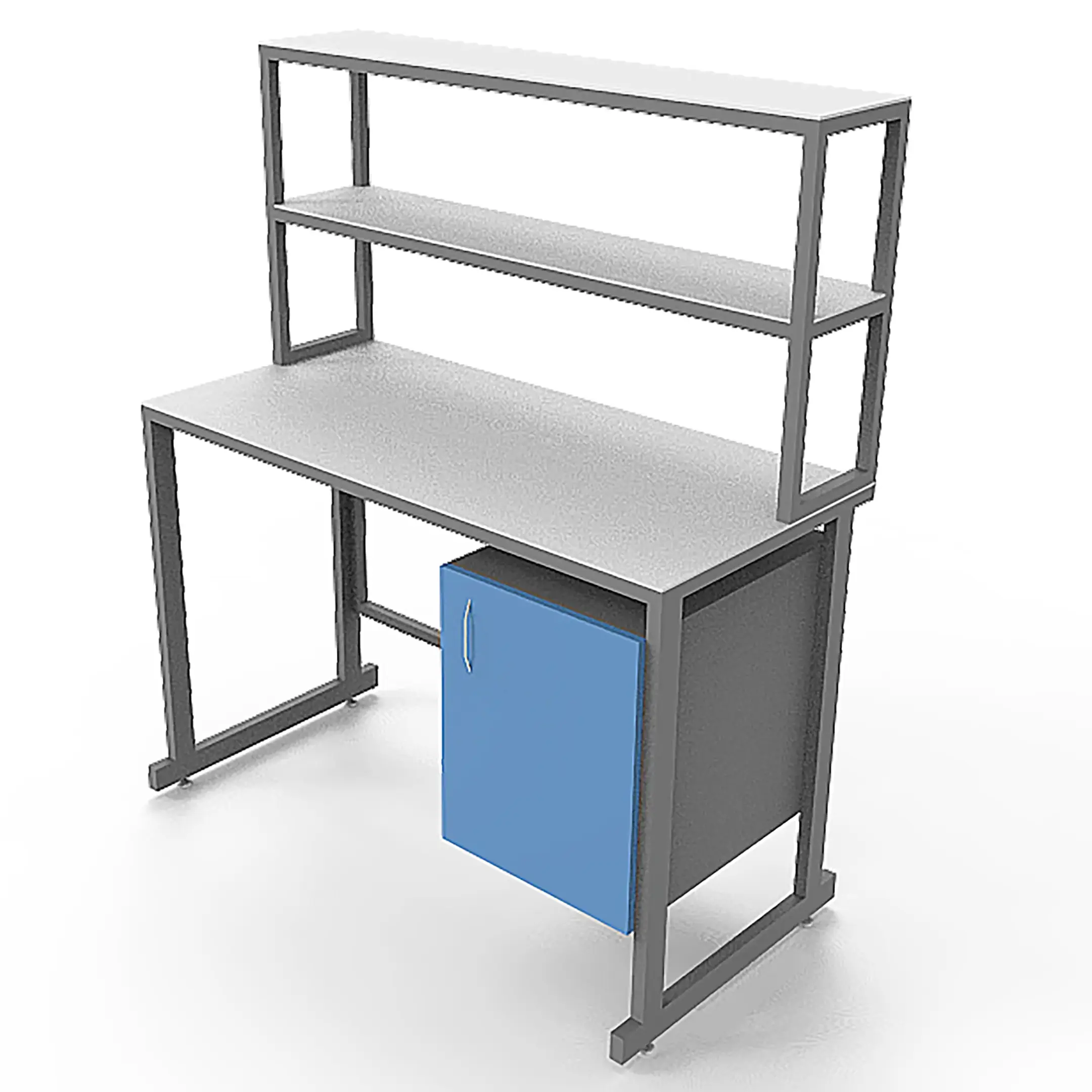 - Удобная система хранения — тумба под столешницей с распашной дверцей и надстройка с двумя полками для хранения материалов и оборудования.