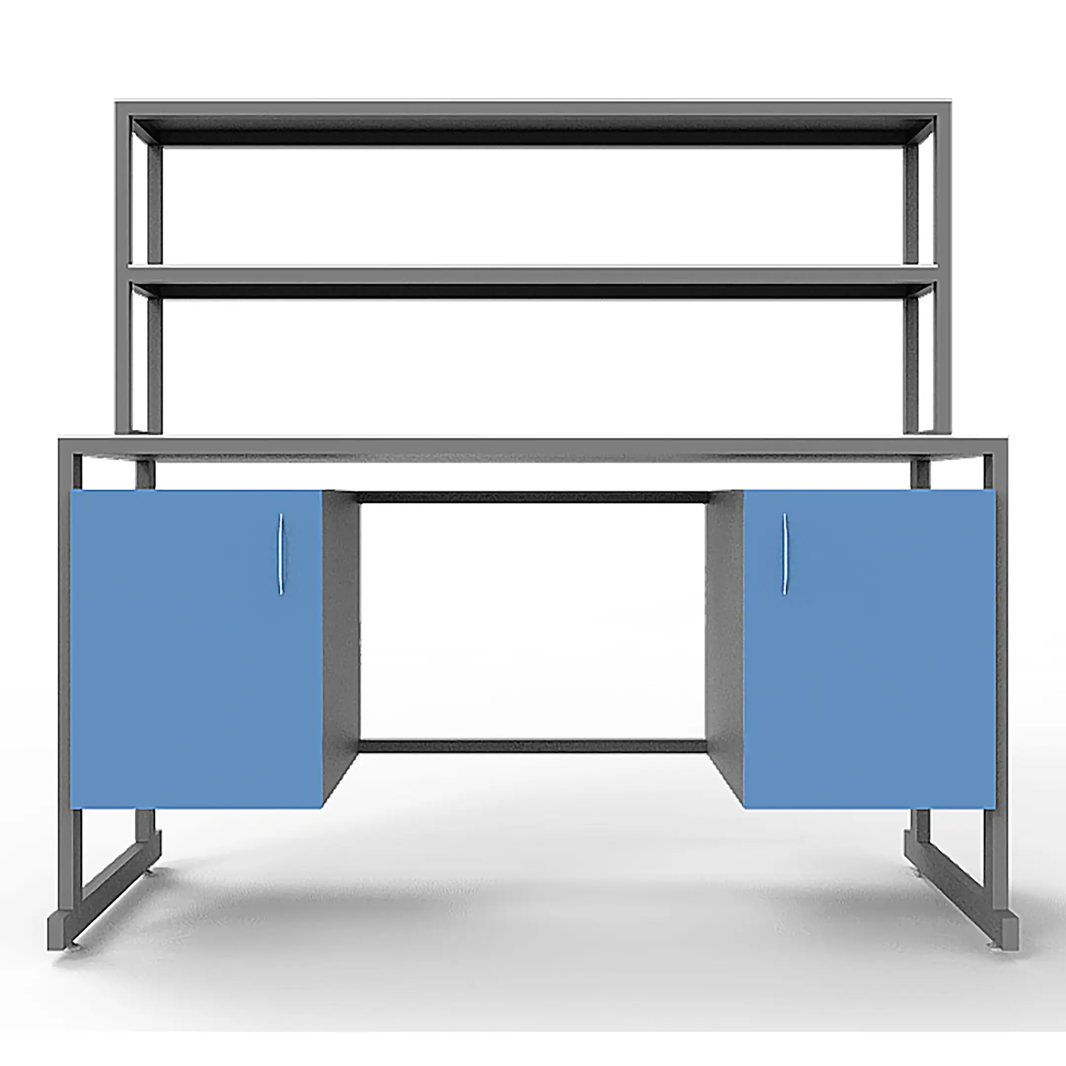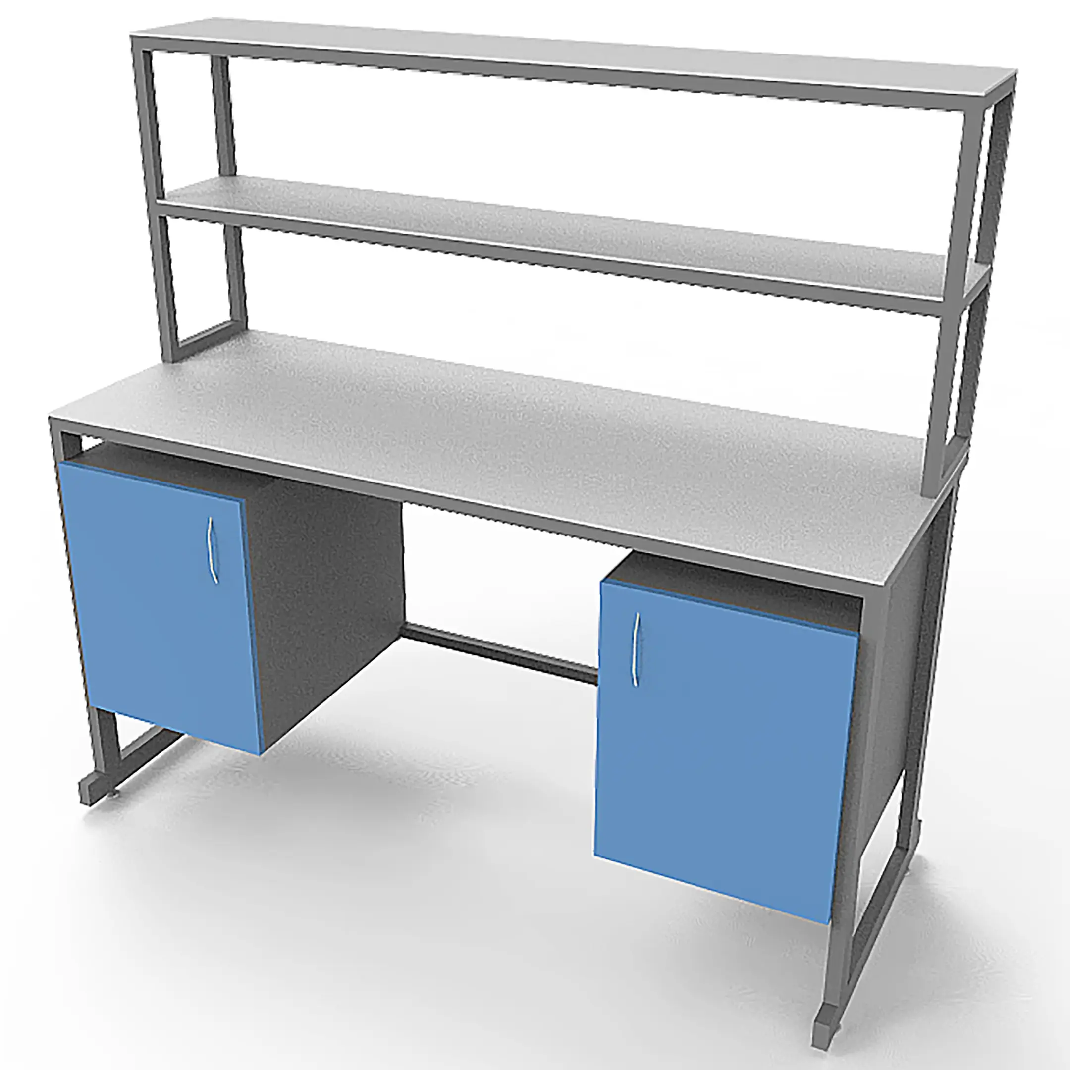 - Удобная система хранения — две тумбы под столешницей с распашными дверцами и надстройка с двумя полками для хранения материалов и оборудования.