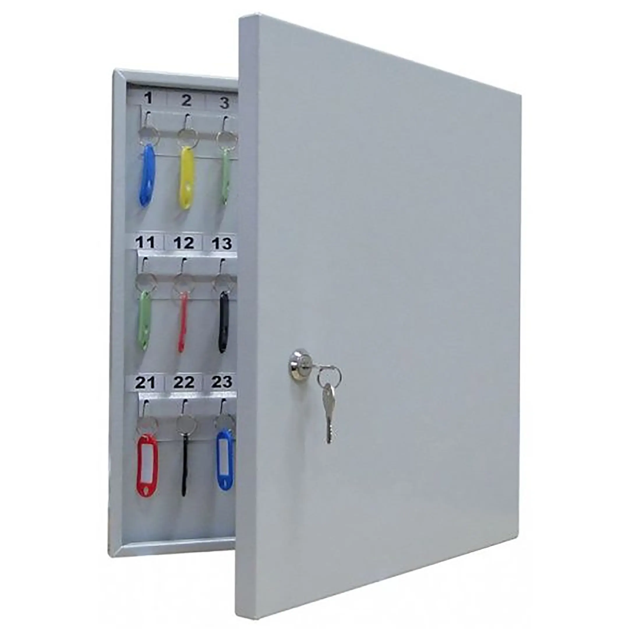 - Четкая организация и мгновенный доступ — шестьдесят пронумерованных ячеек и комплект брелков создают прозрачную и понятную систему хранения. Это позволяет быстро находить нужный ключ, вести базовый журнал учета и легко контролировать, кто из сотрудников получил тот или иной ключ.