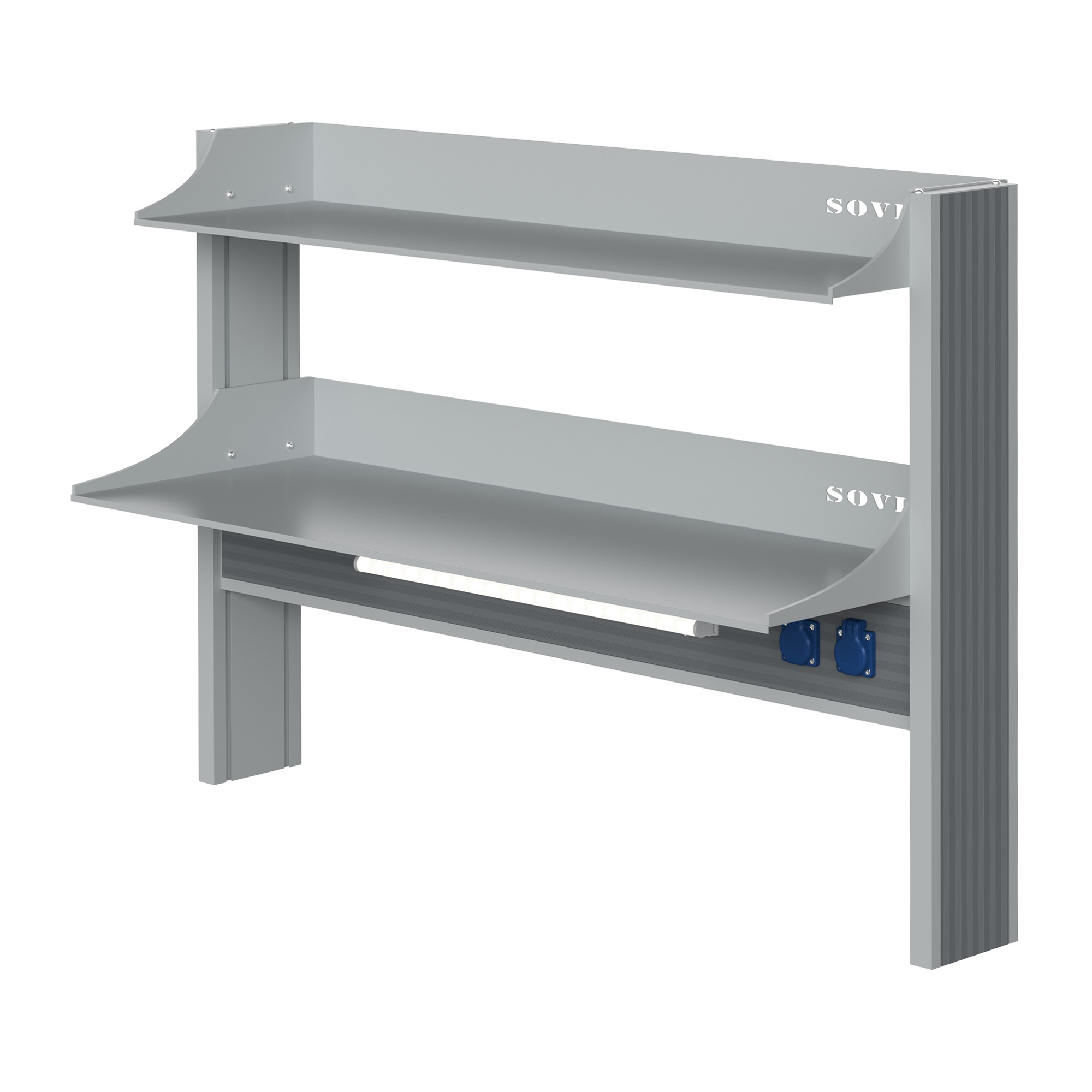 - Оптимальная организация пространства — стеллаж предназначен специально для пристенных столов, что позволяет эффективно использовать вертикальное пространство лаборатории.