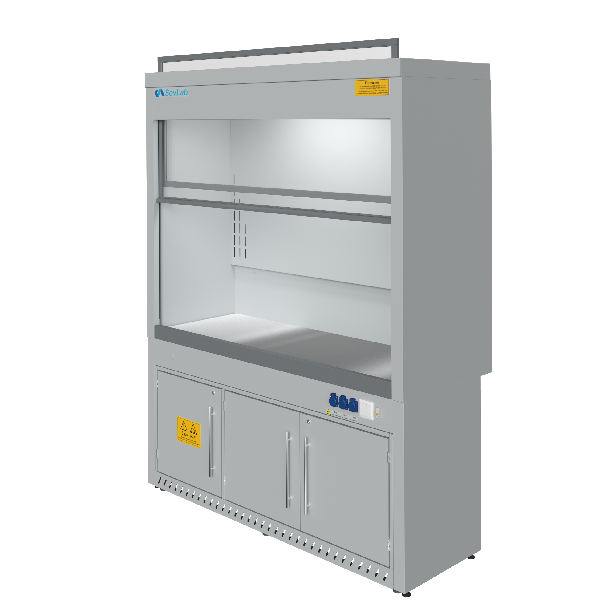 - Безопасная работа с летучими веществами — вертикально-подъемный защитный экран из ударопрочного стекла с системой плавного хода и фиксации.