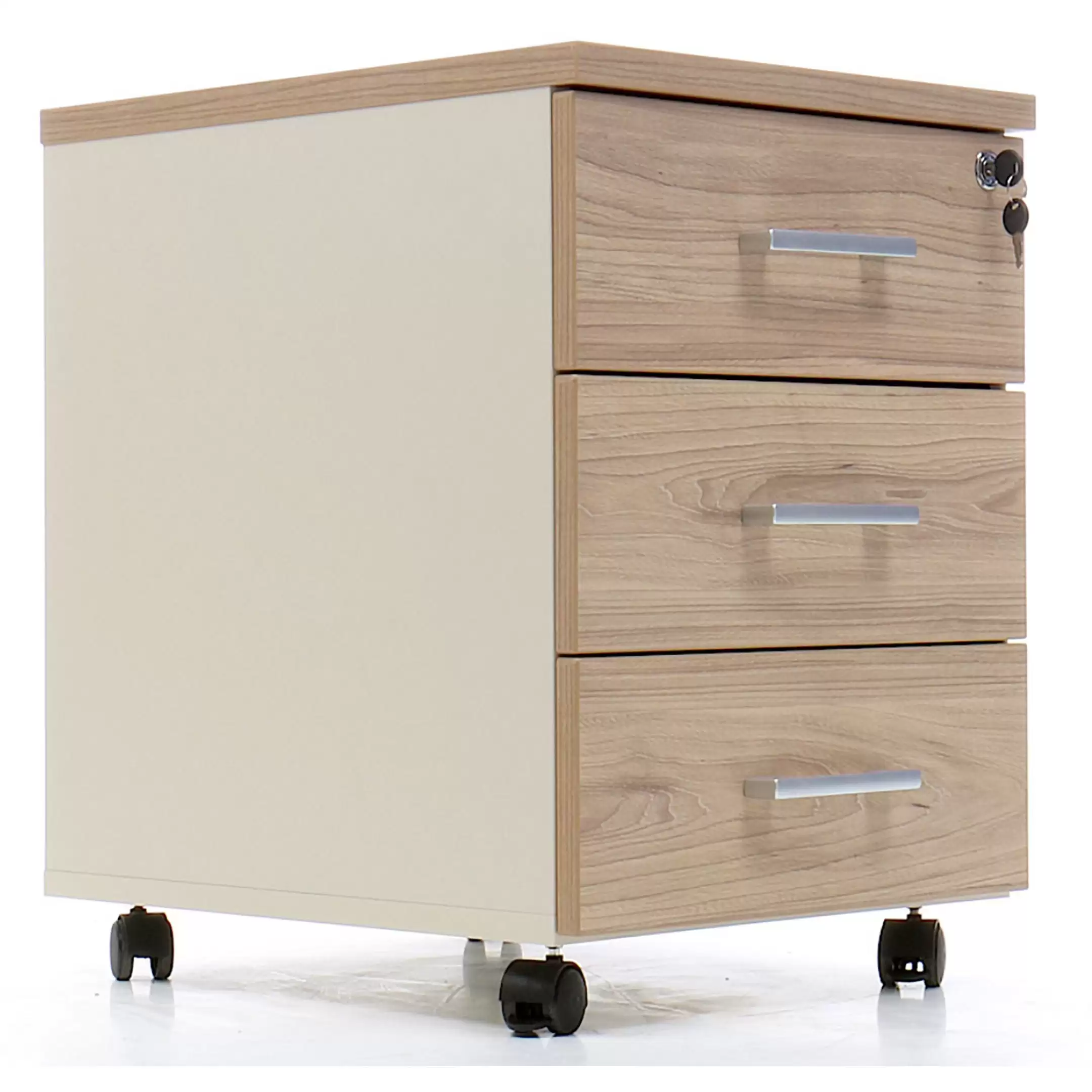 • запирается центральным замком и оснащена пластмассовым лотком для канцелярских принадлежностей в верхнем ящике;