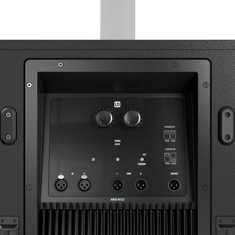 Дополнительный активный сабвуфер LD Systems MAUI 44 G2 SUB позволяет использовать колонную РА-систему в кардиоидном режиме. Для этого необходимо развернуть дополнительный сабвуфер на 180 градусов и активировать кардиоидный режим – таким образом, низкие частоты позади колонной системы будут ослаблены на -15 дБ.